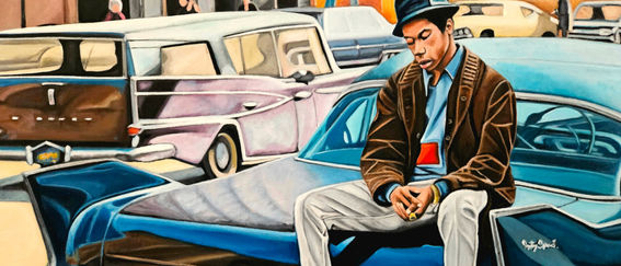 This large oil painting features a forlorn-looking lad sitting on a vintage car in the 1970s. It forms part of the retro Bronx collection I have created. Size (cms) - 75 H - 100 W